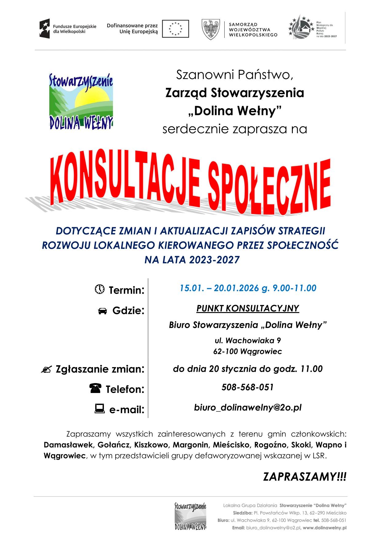 Konsultacje społeczne odbywają się w punkcie konsultacyjnym w terminie od 15.01.2026 do 20.01.2026 w godzinach od 9.00 do 11.00 w Biurze Stowarzyszenia „Dolina Wełny”, przy ul. Wachowiaka 9, (62-100) w Wągrowcu.